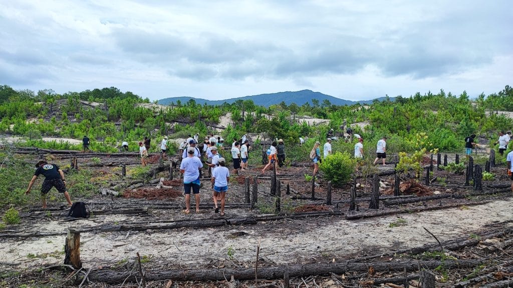 A atividade contou com a participação de cerca de 75 voluntários e resultou na remoção manual de aproximadamente 1.500 indivíduos jovens de Pinus spp., espécie exótica invasora considerada uma das principais ameaças às restingas da Mata Atlântica, além do plantio de 113 mudas de 10 espécies nativas, contribuindo diretamente para o avanço do processo de regeneração ecológica da área manejada.